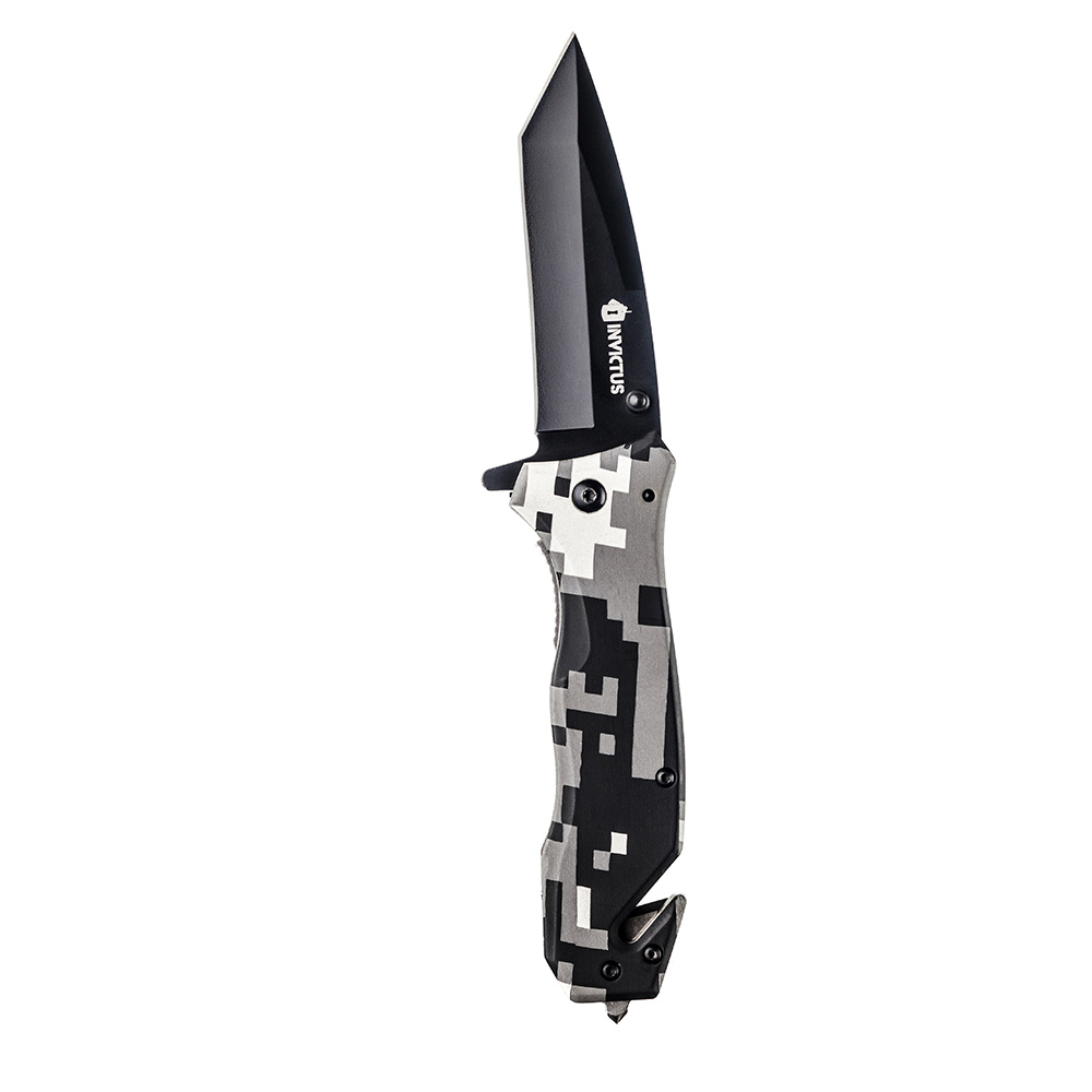 Sua lâmina é produzida em aço inoxidável 420, reconhecido pela boa resistência e durabilidade, ideal para tarefas exigentes. O cabo, fabricado em óxido de alumínio, recebe acabamento com estampa de camuflagem digital urbana, unindo firmeza na pegada e um design moderno e discreto.