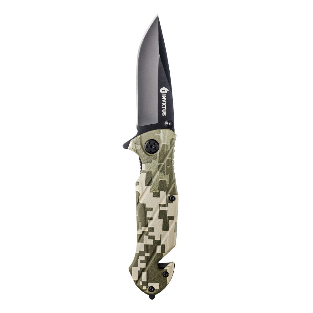 O canivete Squad compõe o portfólio de canivetes táticos INVICTUS. Possui como diferenciais, além da lâmina em aço inoxidável 420, de maior resistência a impactos e maior durabilidade, cabo em óxido de alumínio com camuflado digital, clip tático, pomo metálico (quebra vidro), corta cinto no cabo e abertura fácil e rápida assistida por mola (spring assisted).